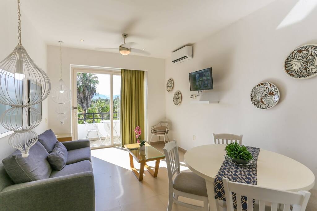 El departamento se compone por una habitación con una cama king size baño completo, cocineta, tapetes para que practiques yoga en el jardín, una pequeña estancia con un sofá cama y balcón privado con vista al campo de golf. Tendrás acceso a las amenidades del condominio y del club de golf* como la alberca, el asoleadero, el spa, el restaurante, entre muchas otras cosas.