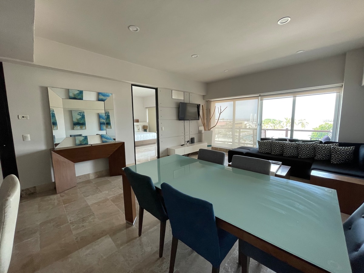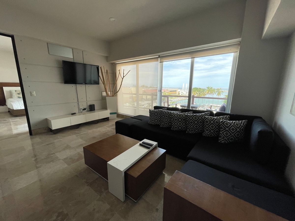 Descubre nuestro espacioso condominio en Deck12, ideal para unas vacaciones únicas. Localizado en el corazón de la zona hotelera de Puerto Vallarta, su privilegiada ubicación te permitirá disfrutar de la oferta gastronómica, compras y diversión que el puerto ofrece a sus visitantes. El condominio está equipado para brindarte una estancia excepcional. La cocina te permitirá preparar tus comidas favoritas y disfrutarlas en el comedor o en la terraza privada con vistas al mar y a los cruceros.